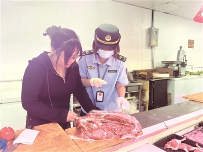 近日,石景山区市场监督管理局广宁街道对辖区内餐饮单位夏季高风险食品原材料进行食品安全检查。检查中,执法人员提示餐饮单位要定期查验货物,及时清理超过保质期及变质的食品原料。