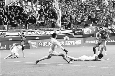 在2024赛季中超联赛第21轮的一场比赛中,北京国安队在主场以2∶1战胜上海申花队。在伤停补时阶段,国安队员王子铭(右一)上演读秒绝杀进球。本报记者 曹立栋 摄影报道