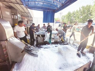 记者昨天从北京新发地制冰厂了解到,为了保证每天几万吨果蔬的新鲜度,职工加大马力制作冰块。目前,该厂每天可制冰1000吨,满足市场保鲜需求。除制作整块冰外,厂里还设有碎冰加工处,冰块打碎装袋后就能给蔬菜“降温”,也方便商户购买使用。