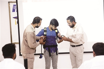 记者走进一间培训室,电站消防工程师赛义德·巴希尔正给暑期实习的学员进行安全培训。在他指导下,3名学员练习佩戴消防呼吸器。“我非常享受这份工作。”赛义德说。