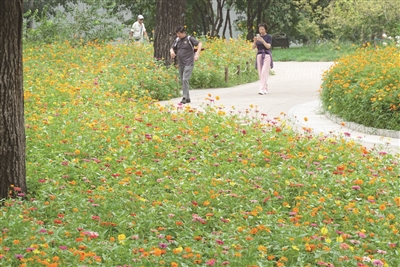 近日,在国家植物园(北园)科普馆西侧花卉展区,二十万株鲜花组成的花海已进入最佳观赏期,花期可以延续到8月下旬。科普馆西侧花卉展区占地面积8000平方米,目前展示的主要是黄秋英(硫华菊)、秋英(波斯菊)、百日菊等植物。除了花海展区外,园区内的特色花境,木槿、紫薇、月季等夏日花卉以及湖中的荷花、睡莲等也都在观赏期。本报记者 周美玉 摄影报道