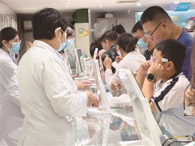 暑假期间,同仁验光配镜中心诊室、验光、配镜、散瞳等各个区域都排着长队。据同仁验光配镜中心店内的工作人员介绍,近日配镜的人数比平时翻倍增长,其中中小学生占比最高。