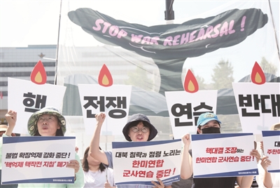 近日,“和平统一开创者”“朝鲜半岛和平行动”等韩国民间团体在首尔龙山总统府前举行抗议集会,要求立即停止韩美军队19日启动的联合军事演习。图为韩国民众在首尔龙山总统府前举行抗议集会。 新华社发