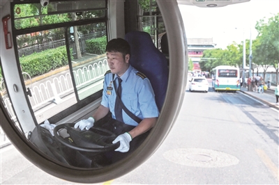 上午7点半,北京公交集团电车分公司第19车队5路驾驶员张涛早早来到5路菜户营公交场站,对自己的着装进行整理,做完岗前宣誓、酒精检测等准备工作后,他来到了车辆前认真检查即将驾驶的车辆。大约半小时后,他驾驶公交车准时驶出场站。