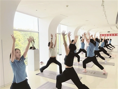 近日,朝阳区东湖街道总工会先后在多家企业开展了共计12场瑜伽培训,约500余名职工参与。现场,在导师的带领下,职工们随着轻柔的音乐放松身心,感受健身带来的愉悦。本报记者 刘欣欣 摄影报道