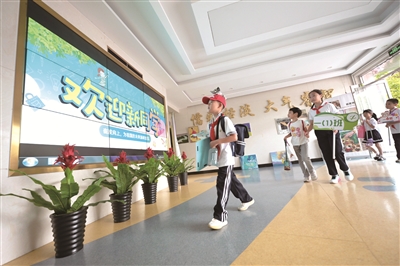 9月1日,北京市中小学开学,师生迎接新学期。当天,朝阳区实验小学一年级新生陆续走进校园,高年级的大哥哥大姐姐为他们佩戴了小红花,欢迎他们加入这个大家庭。新学期伊始,学校全新打造的数字体育教室也与同学们见面。