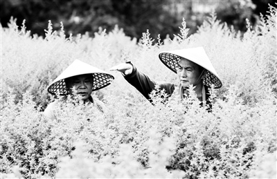 融安县是广西青蒿草种植大县之一,是目前国内外较大的青蒿素生产基地,青蒿素年生产量超过100吨,占全球总产量的四分之一。近年来,当地积极发展青蒿产业,生产的青蒿素主要出口到非洲国家,用来作为抗击疟疾的基药。图为工人在查看青蒿生长情况。 新华社发