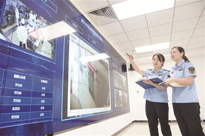 又是一年开学季,通州区市场监管局全面深化数字化监管改革,在全区299家高校、中小学、幼儿园食堂和2家校外供餐单位全面推行非现场监管,通过科技监管、智慧监管守护广大师生“舌尖上的安全”。图为在通州区市场监管局远程智慧监管运行指挥中心,两名执法人员通过监控屏幕对校园食堂的后厨开展线上检查。