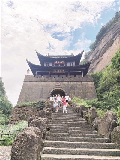站在雷鸣桥上见左前方关楼雄踞绝壁之间。过雷鸣桥,顺着石梯而上,只见关楼威严如将军把守,三层关楼上从下而上的门楣匾上刻有“剑阁”“天下雄关”“眼底长安”。过城楼门洞,就是剑门关景区南门。出南门,一路上有碑牌介绍三国故事,当时蜀国大将姜维镇守剑阁,北伐兴复汉室,百折不挠。出景区大门,蓦然回首,只见右边石壁成人头像,传说那是蜀汉大将军姜维的形象,他赤胆忠心,志继孔明,力复汉室。其死后,英魂返关,在隘口化作武士形象,护佑蜀汉故土。关楼,便是李白写的“剑阁峥嵘而崔嵬,一夫当关,万夫莫开”之处。