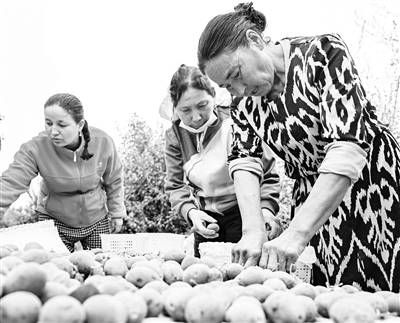 今年是新疆生产建设兵团成立70周年。黄沙披新绿,戈壁变良田。从肩扛手提到农机轰鸣,从依靠农户经验种地到根据科学数据种地,一代代兵团人不忘屯垦初心,在天山南北接续奋斗,将茫茫戈壁荒滩开垦为绵延千里的良田沃野。图为新疆生产建设兵团第十四师昆玉市七十四团老兵镇种植户在挑选和打包刚刚采摘的西梅。新华社发