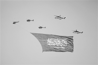 9月23日,沙特阿拉伯举行活动庆祝国庆日。图为直升机编队悬挂沙特国旗在利雅得上空飞行。