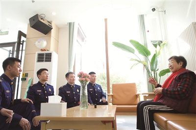支队巾帼志愿服务队、文艺小分队联合右安门消防站“蓝焰雷锋号”,走进丰台区“首开寸草”养老院开展关心关爱送温暖活动,并慰问参加抗美援朝战斗的退役老兵。“火焰蓝”志愿服务队员和老人们拉家常、聊生活,耐心为老人们讲述日常安全知识,并开展义务巡诊,送上围巾、梳子等暖心礼物;“丰力发电”乐队和基层文艺骨干为老人们弹唱歌曲,老人们挥舞双手,轻轻拍手哼唱,让原本沉静的养老院热闹许多。抗美援朝老兵倪翠兰奶奶还为大家上了一堂生动的党课,年轻的消防员围坐在年过九旬的倪奶奶身边,认真倾听她讲述曾经的荣耀时刻……