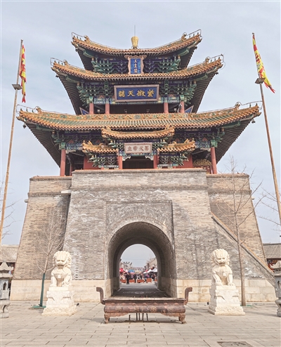 寻至其下,仔细观望,整体建筑坐北朝南,底座呈四方形,三层四面,高约20米。四根通天柱撑起琉璃宝顶,显得底蕴厚重、威风凛凛。阁的四面各悬匾额,南侧自上而下为“玉皇阁”“紫微天关”“昌天帝主”,东侧为“阜民”,西侧为“文献明邦”,北为“至上”,字迹苍劲有力,古色古香。