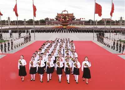 默哀毕,手持鲜花的少年儿童面向人民英雄纪念碑高唱《我们是共产主义接班人》,并致少年先锋队队礼。