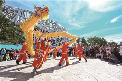 国家体育场前,一场精彩的舞龙舞狮表演正在进行。巨龙在舞龙者的手中上下翻飞,活灵活现;狮子在锣鼓声中跳跃舞动,威风凛凛。市民游客们围在周围,不时发出阵阵喝彩声。