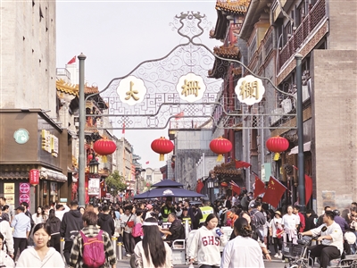 在前门步行街,游客们漫步其中,感受着中轴线的人文风情。节日的北京市场繁荣有序,游客们在这里可以品尝到各种地道的北京小吃,还可以购买到精美的手工艺品。