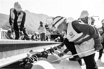 10月9日,在重庆市黔江区渝厦高铁马家桥施工现场,第一组500米长钢轨稳稳落下,标志着渝厦高铁重庆东至黔江段全面进入铺轨阶段。渝厦高铁重庆段从重庆主城区到黔江区,全长269.5公里,是国家中长期铁路网规划的“八纵八横”高铁网中渝厦通道的重要组成部分。图为工人在进行铺轨作业。 新华社发