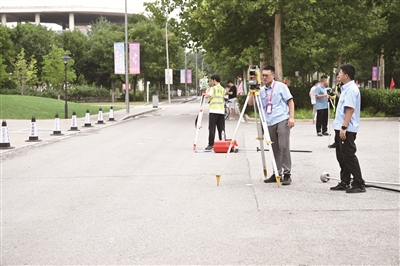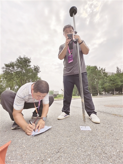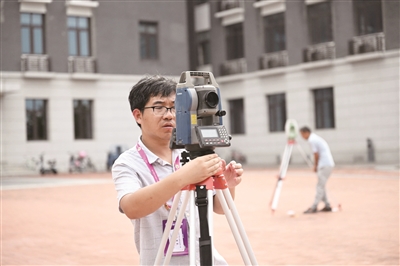 当天,首先进行的是技能操作考核,这项考核分为“外业”和“内业”两项。“‘外业’是在室外,选手们使用仪器设备进行测区勘测;‘内业’则是转场至室内,选手们通过在室外采集的各种数据,用电脑对勘测区域绘图。”北京测绘学会相关负责人介绍。