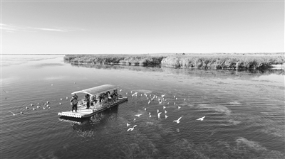 金秋时节,内蒙古阿拉善盟额济纳旗各景区风景如画、游人如织。图为游客在居延海景区乘船游览。