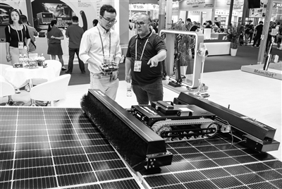 日前拉开帷幕的第136届广交会以“服务高质量发展,推进高水平开放”为主题,共分三期举行,分别聚焦“先进制造”“品质家居”“美好生活”题材,众多绿色低碳产品在线下展出。图为采购商在了解一款太阳能面板自动清洁机器人产品。