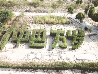从空中俯瞰巴基斯坦西南部港口城市瓜达尔,中巴友谊林这片绿洲在瓜达尔以黄色为主色调的黄沙地上格外亮眼。再拉近些,还能看到用桤果木修剪而成的“中巴万岁”四个立体大字。