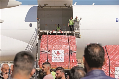 近日,中国援助的紧急人道主义医疗物资运抵黎巴嫩贝鲁特拉菲克·哈里里国际机场。据中国驻黎巴嫩大使馆介绍,这批物资总重58吨,包含麻醉剂、一次性使用气管插管、手术衣等多项黎巴嫩急需的医疗物资。图为在黎巴嫩贝鲁特拉菲克·哈里里国际机场,工作人员将医疗物资从飞机上卸下。 新华社发