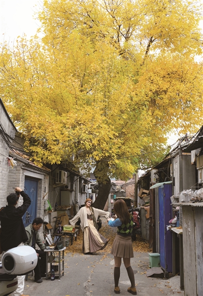 位于东四十三条胡同31号院前的白蜡树,在这个秋天“火”了。阳光洒在树叶上,闪烁着金色的光芒,人们争相与白蜡树合影,感受着京秋的韵味。