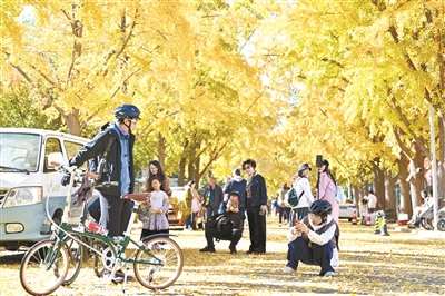 近日,北京进入银杏最佳观赏期。11月3日,记者在朝阳区三里屯东五街看到,道路两旁栽满了银杏树,北风吹过,金黄色的银杏叶簌簌飘落,迷人又绚丽,引得游客纷纷掏出相机,定格这一美丽的瞬间。