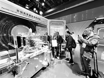 在中国馆内,嫦娥六号探测器1∶2模型吸引了很多人的目光,该探测器原件重约8.3吨,尺寸约4.5米×7.2米,太阳翼展开后长度约14米,自下而上分别是轨道器、返回器、着陆器和上升器。今年,嫦娥六号完成了人类历史上首次月球背面采样和返回,突破月球逆行轨道设计与控制、月背智能采样和月背起飞上升等多项关键技术。