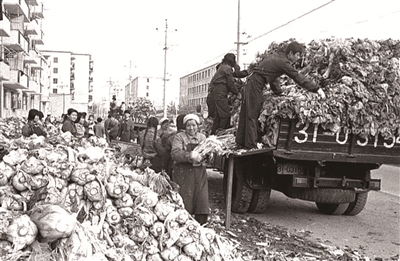 北京人吃的大白菜除了京郊产的,也有河北、山东那边过来的,其中最受人青睐的是河北玉田产的白口菜,棵大,磁实,吃着爽口,尤其是做馅儿吃饺子,绝对的味儿正。白菜呲晾之后,被整齐地码放在房檐下,苫好草帘子、油布,储存好了。要是院子里宽敞,还可以挖个菜窖,那样储藏的效果更好。