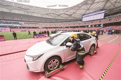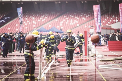 在国家体育场内,来自全市16区、北京经济技术开发区、天安门地区、重点站区和轨道交通系统的20支代表队、661名消防安全重点单位、社区(村)自防自救力量队员同场竞技,参加了男子原地着装佩戴空气呼吸器、男子个人全能、女子灭火器灭真火、男(女)子双人消火栓出真水、团体科目6个竞赛项目的角逐。