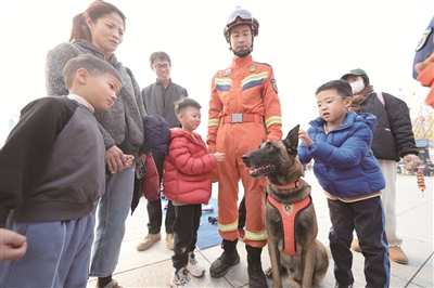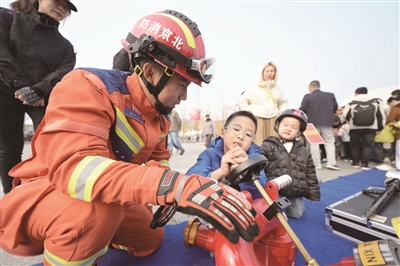 场内比赛热火朝天,场外活动也丰富多彩。在奥林匹克公园景观大道,设置了消防特种车辆展示、高精尖装备展示、消防救援技能表演、人工智能机器人互动体验等9个参观区域,市民群众共同观看了消防搜救犬技能表演,体验了灭火器灭真火、消火栓出水、烟热模拟逃生、VR消防实景体验、消防产品真伪辨识等科普项目,与西城消防“胖哒”、朝阳消防“泡泡玛特”等卡通形象合影留念,近距离体验消防、感受消防、学习自防自救知识。
