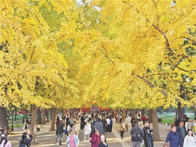 连日来,中山公园银杏大道游人如织。道路两侧仿佛披上了“黄金甲”,与古建园林的红墙琉璃瓦相互映衬,游客漫步其中,沉醉在如诗如画的景色中。