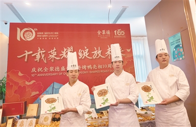 中国全聚德集团近日宣布,今年是全聚德“盛世牡丹”烤鸭亮相10周年,这道曾出现在2014年APEC会议欢迎晚宴上的菜品已完成食品化改造,推出“盛世牡丹手工片制烤鸭”礼盒。本报记者 孙妍 摄影报道