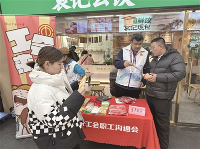 本报讯 (记者 刘欣欣) 近日,朝阳区和平街街道总工会在辖区天丰利市场开展“传递温暖 帮扶救助”主题职工沟通会。会上通过收集职工和企业诉求,持续推进职工沟通常态化。