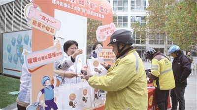 本报讯 (记者 刘欣欣) “请您稍等,这份暖心餐包送给您。”看到不远处的外卖配送员和快递员,朝阳区建外街道总工会的工作人员热情地招呼着,将这份暖心餐包送到他们的手里。为进一步做好党建引领新就业形态劳动者群体服务工作,建外街道总工会近期组织开展@“新”邻里回家吃饭宣传周活动,向奋战在建外街道的新就业形态劳动者送上温暖和关爱。