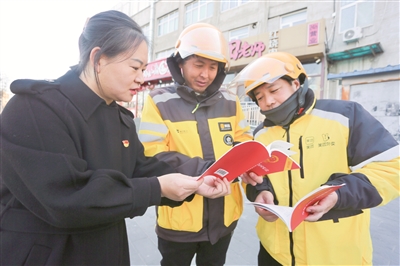 近日,丰台南苑街道党群服务中心联合街道司法所开展了以“大力弘扬宪法精神,推动进一步全面深化改革”为主题的国家宪法日普法宣传活动。活动中,南苑街道司法所、党群服务中心工作人员向快递员、外卖配送员开展普法宣传,聚焦劳动者劳动保障权益问题,发放《中华人民共和国宪法》口袋书,通过现场内容宣讲等方式向新就业形态劳动者群体普及宪法知识。本报记者 曹立栋 通讯员 史莉 摄影报道
