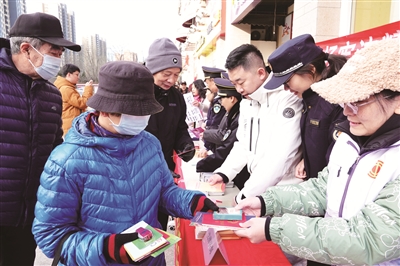 近日,朝阳区来广营地区总工会联合地区司法所、派出所等单位,举办国家宪法日宣传活动。活动中,工作人员用通俗易懂的语言,向过往职工群众宣讲宪法知识,引导职工群众养成自觉学法、办事依法、遇事找法、解决问题用法、化解矛盾靠法的法治思维。本报记者 刘欣欣 摄影报道