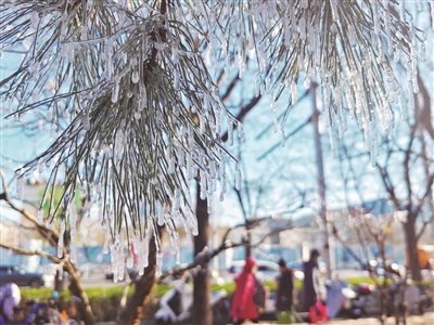 正值寒冬,记者在广阳谷城市森林公园看到,园林工人正在进行浇灌“封冻水”工作,全力保障绿化植被安全越冬。由于天气寒冷使得周边植物出现了美丽的树挂,引得路人驻足欣赏。