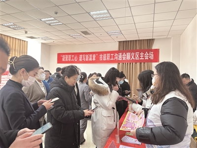 “您好,扫描北京工会i会员小程序二维码,就可以加入北京工会大家庭”“成为工会会员,多种服务陪伴你”……11月26日,顺义区总工会组织全区27家镇、街道、功能区总工会,统一开展以“加入工会 温暖随行”为主题的市级职工沟通会,广泛吸纳“两新”组织和新就业形态劳动者入会。活动现场,此起彼伏的招呼声让这个寒冷的冬日多了几分温暖。