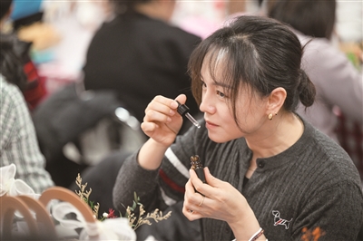 户外寒气逼人,室内温暖如春。在手工现场,老师先介绍了香薰作用与功效,随后讲解了制作流程及注意事项,并分发已经准备好的原料。大家拿到材料就迫不及待地动起手来,多数人选择的是玫瑰味道的香薰,它有安抚、舒缓身心的功效。大家在用心感受摆放干花的乐趣的同时,还考虑不同香味的功效并进行搭配,制作一款自己喜欢的香薰作品。