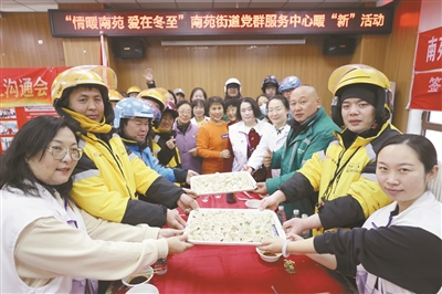 冬至即将来临,在丰台南苑街道党群服务中心,南苑街道总工会、阳光星苑南区社区、“小憩驿站”成员单位负责人和新就业形态劳动者群体、社区居民欢聚一堂包饺子,大家热热闹闹吃了一顿“团圆饭”。
