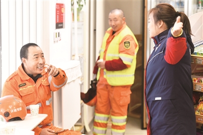 第一次走进该工会驿站的情景让陈双至今记忆犹新。“当时我腋下夹着保温杯,把快件递过去。她们看见我的保温杯空了,就主动给我加水,还说工会驿站随时欢迎我们。”后来,陈双就成了这里的常客,每次送快递路过这里都会进来歇歇脚。“户外工作者很辛苦,能给他们在寒冷的冬天送去温暖,我们感到很开心。”北京石油实润站副店长陈光表示。