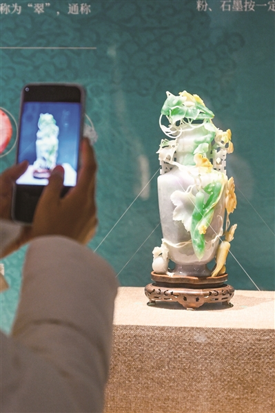 展品中的一件“翡翠三秋瓶”可谓镇馆之宝,该作品由中国工艺美术大师王仲元设计,用一整块珍稀的杨柳绿翡翠雕刻。作者运用“田园风光图”巧妙地设色,琢出顶花带刺的黄瓜、秋豆、小萝卜,顶盖上一只秋鸣的大蝈蝈十分自然,秋实、秋韵、秋色“三秋”浑然一体,一派令人陶然的金秋景色。尤为珍贵的是,王仲元大师1972年7月16日画制的手稿也是首次亮相。