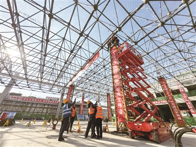 本报讯 (记者 宗晓畅 彭程 通讯员 董策) 近日,在雄忻高铁阜平站施工现场,钢结构网架在8台顶升设备协同的作业下完成顶升,标志着雄忻高铁阜平站实现站房全面封顶,为接下来转入站房室内外装修奠定了坚实基础。
