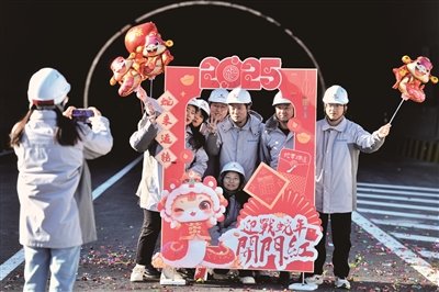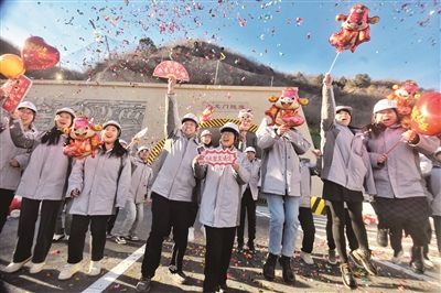 “庆祝一下,大家辛苦4年了!”项目书记杜连杰赶忙组织大伙儿,准备了气球、礼花和拍照板,和项目经理葛晨雨一起,带着大家来到亲手建造的高速公路小龙门隧道,庆祝工程顺利交付。