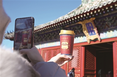 ▲游客手持庆成宫主题茶饮纸杯与庆成宫正殿合影