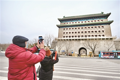 经修缮、布展后,位于北京中轴线上的正阳门箭楼近日恢复向社会公众开放。试运行期间,正阳门箭楼采取全员实名制免收费预约参观。图为市民游客在正阳门箭楼打卡拍照。