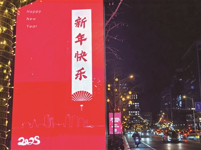 夜幕降临,京城流光溢彩,街头巷尾弥漫着新年的气息。金融街两侧的LED屏被“新年快乐”的祝福“霸屏”,巨大的字幕在夜空中闪烁,传递着温馨的新年祝福。