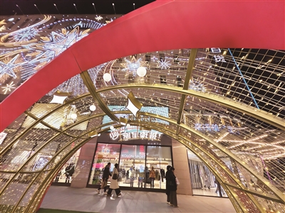 西单商业区空中连廊被各式新年灯光装点得流光溢彩